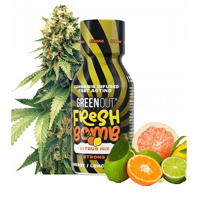 Green Out® Fresh Bomb, suplement diety o smaku Citrus Mix – to smaczny, owocowy suplement konopny o przyśpieszonym oraz poszerzonym działaniu, zawierający naturalne fitokanabinoidy, flawonoidy oraz profil terpenowy odmiany Lemon Haze. Jest to w 100% naturalny, legalny produkt a zarazem jedyny, o tak synergicznym działaniu. Wyprodukowany z najwyższej jakości olejku konopnego. Nowa ulepszona receptura.